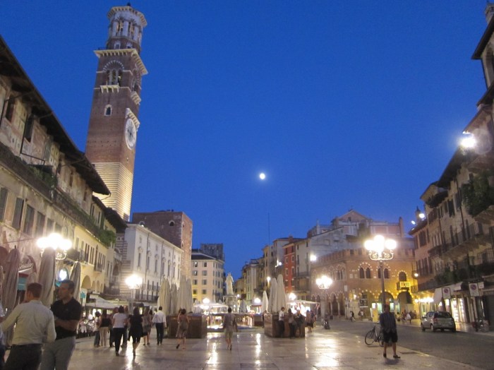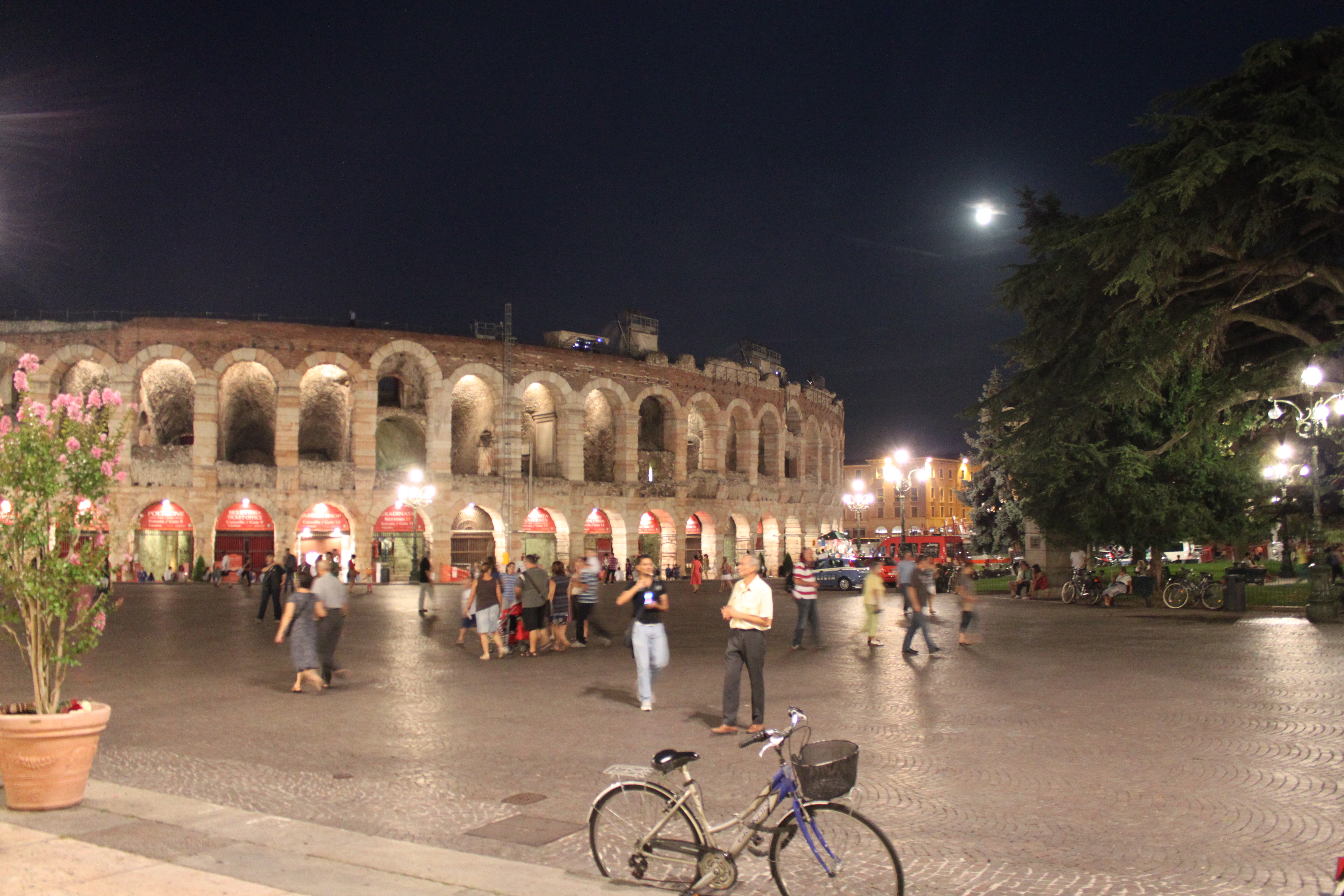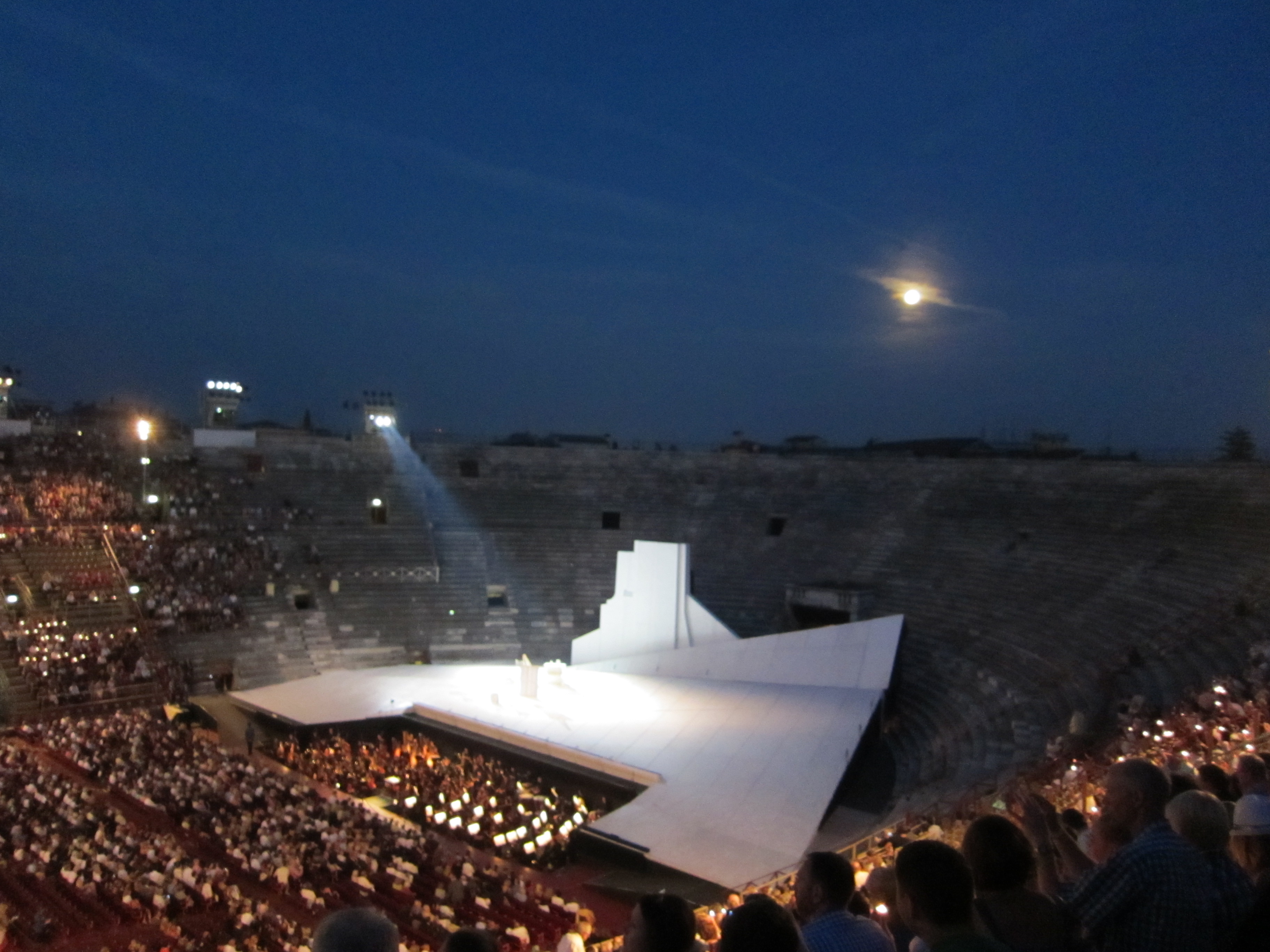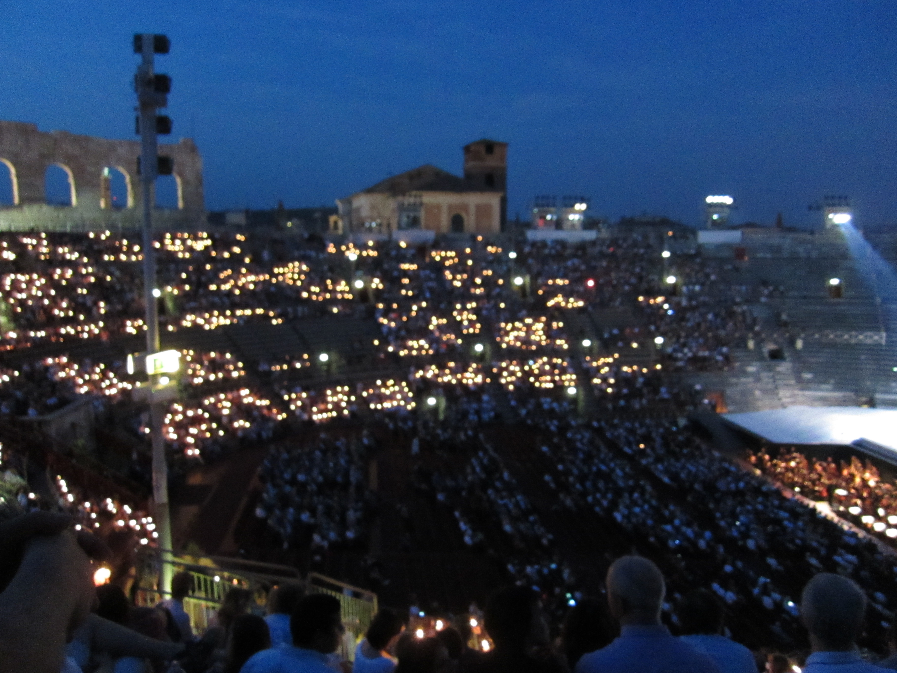 Another highlight of being in Verona at this time of year is that it is opera season! The beautiful Roman Arena in Piazza Bra, which dates back to the 1st century AD, hosts operas all through the summer. I had seen Carmen at the Arena nine years ago and remember it as being a truly magical experience. Because of this, Johnny and I bought tickets to see La Boheme about six months ago. We chose La Boheme, because the musical Rent was inspired by it, so we thought we’d have an easier time following the story line. We treated ourselves to an amazing dinner at Botega Vini (a must-stop Verona institution with a small novel of a wine list) and then made our way down Via Mazzini to Piazza Bra and climbed up to our seats on the stone steps within the Arena. With a full moon as a backdrop to the stage, and hundreds of people holding lighted candles as dusk set in and the orchestra began, we felt transported to another time. It was an amazing evening that I will always remember.