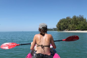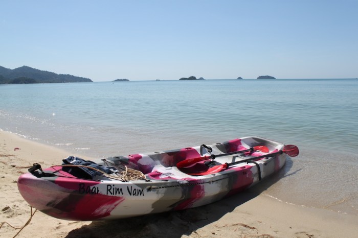 Baan Rim Nam (“house on the water”) isn’t just a clever name; the three bedrooms and two communal decks are built on stilts over the Klong Prao river estuary leading out to the beach. It’s a little off the beaten path (about a 20 minute walk from the main road plus a final crossing of wooden planks above a mangrove), but its setting is worth the extra effort. To get to the beach, we would either have to walk a couple minutes down a dirt path through a grove of palm trees (not-so-fun fact; falling coconuts kill 150 people worldwide per year) or paddle down the estuary in one of Ian’s kayaks. Our typical day at Baan Rim Nam would be: wake up, kayak across the estuary for some coffee, walk to the beach, swim, get some lunch, read on the deck, kayak across the estuary for a cheap massage, walk to the beach to see the sunset, walk to town for some dinner and finally relax on the deck watching the local villagers row by. Not bad, eh?