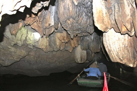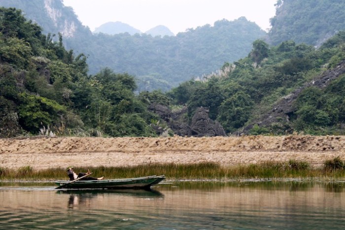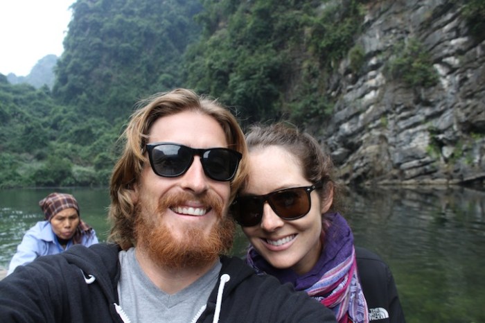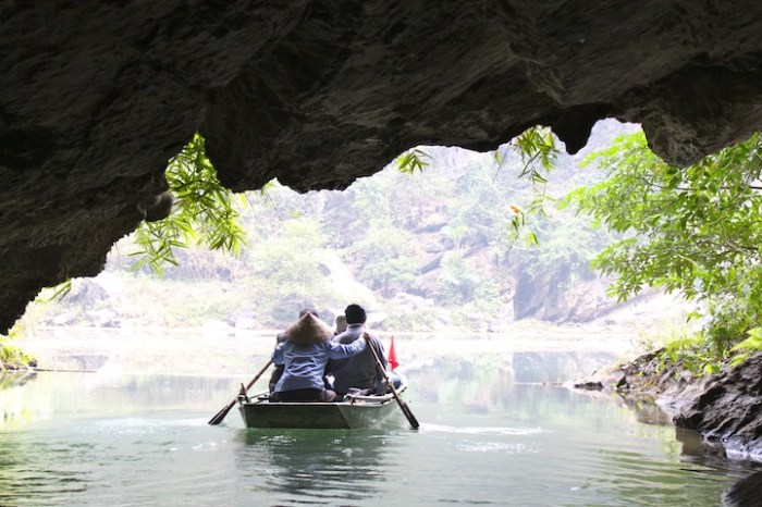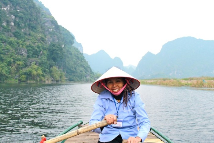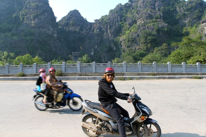 We were really enjoying our introduction to Vietnam in Hoi An, but unfortunately the weather wasn’t doing us any favors.  With rain, rain and more rain in the forecast for the rest of the week, we decided to leave central Vietnam and head north a couple days early.  After an, ummm, interesting overnight train ride (more on this soon), we arrived in Ninh Binh.  Ninh Binh itself is a bit of a hole, but the stunning karst landscape on the outskirts of town, often called “Ha Long Bay in the rice paddies,” makes it worth a stop.  With only one full day, our guesthouse suggested we borrow their scooter and ride to nearby Trang An to check out some of the famous caves and grottoes.  When we pulled up to Trang An, we found a handful of Vietnamese women offering to row us around in their tiny boats for a couple hours for a few bucks.  Although we were skeptical that a four foot tall, 70-year-old woman could get us very far (I nearly passed out while rowing our boat on Lake Bled), we decided to go for it.  We’re glad we did.  The scenery was incredible, and the accompanying peace and quiet (Vietnam is crazy!) was just what we needed.  Also, much to our surprise and delight, rather than row around these giant limestone cliffs, we were able to row right through them, as centuries of erosion has produced numerous caves and underground waterways.  For the next couple of hours we explored this beautiful landscape, passing only  hidden pagodas and a handful of Vietnamese locals (who somehow row with their feet).  Super cool.  So, how will “Ha Long Bay in the rice paddies” stack up to the actual Ha Long Bay?  We’ll find out soon.