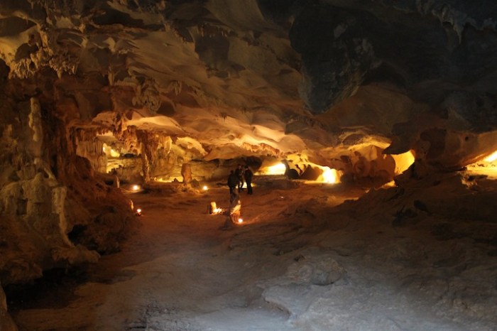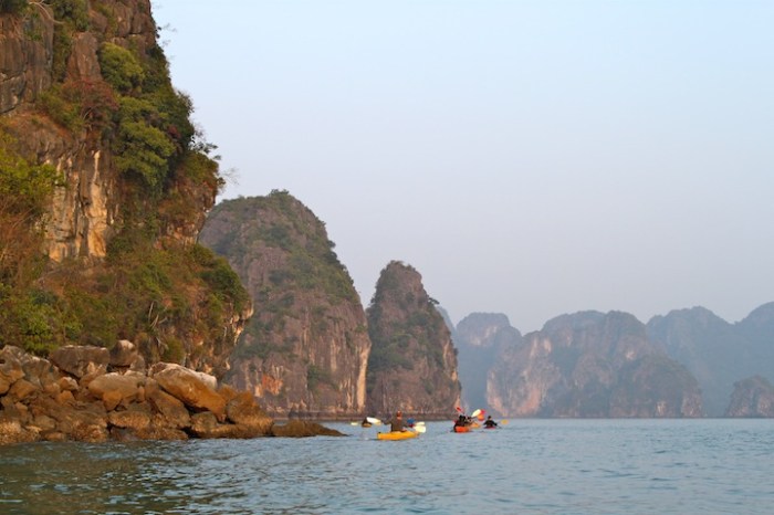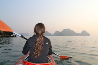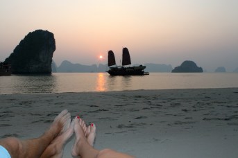 After a yummy lunch packed full of fresh seafood our boat docked near one of the islands in the bay where we climbed up to see some views and explore a couple of caves. Many of the islands are hollowed with caves, rivers and lakes, and local fisherman used to live in them. Unfortunately many of the stalagmites and stalactites had been stolen or sold off before the bay became a protected area, but the caves were still magnificent and beautiful. We also had the chance to take out kayaks and paddled through and around dozens of islands. This was one of our favorite parts of the trip, as the sun was starting to sink and we were surrounded by towering silhouetted peaks in every direction. Once back on the beach we laid on the sand and watched the sunset, a truly relaxing and mesmerizing experience.