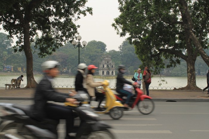 Stand on any street corner in Hanoi and observe the surroundings for a few minutes and you’re bound to have your mind blown.  You’ll see a woman steaming some crabs on a sidewalk full of tiny plastic chairs, a man selling $0.30 glasses of bia hoi out of what appears to be his bedroom, women in conical hats selling exotic fruits you’ve never seen before, a beautiful French villa juxtaposed with modern office buildings, and a seemingly endless flow of scooters, one of which is carrying three butchered pigs and another of which is somehow carrying a family of five.  Welcome to Hanoi, the craziest city Anna and I have ever visited.  Nothing comes easy in Hanoi, including crossing the street.  With no gaps in the never-ending blur of scooters anywhere in sight, you basically just have to go for it and trust the scooters will swerve around you.  It was actually pretty scary at first, but after I channeled some wise words from one my heroes, Bhodi from Point Break, (“Fear causes hesitation, and hesitation will cause all your worst fears to come true”), I was OK.