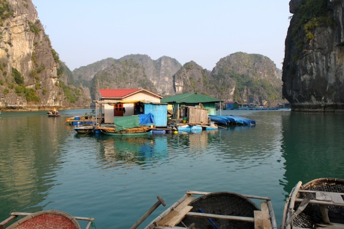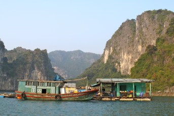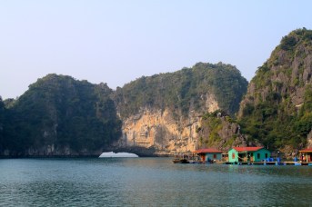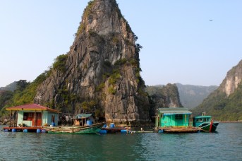 After a lovely evening on the boat with another delicious meal and the company of new friends, we awoke early the next morning to more blue skies and a visit in small bamboo boats to a local floating fishing village called Vong Vieng. The woman rowing our boat was nice enough to offer us some traditional hats, soon followed by some neon orange life vests, so we looked pretty ridiculous cruising the bay (we noticed that no one else in other boats had on hats OR vests…hmmmm). The fishing village was amazing…like a land lost in time. Colorful little houses stacked in a row with beautiful boats tied up at their front doors…the 50 or so families had been living there for generations. We stopped off at the local school to see the cute children hard at work and then headed back through the maze of islands to our boat.