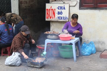 Steaming some crabs on the sidewalk Cooking some bun cha on the sidewalk