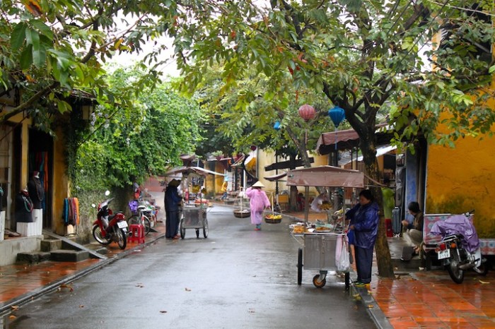 Although we didn’t luck out with the best weather, the rain didn’t deter us from exploring the lush, colorful streets of the Old Town which happens to be a UNESCO World Heritage Site. Hoi An was a major trading port back in the day (15th-19th century), drawing many foreign influences to the area, resulting in the eclectic architecture of the city. The narrow streets lined with oversized palms and ochre-hued buildings gave us the strange sensation of being transported back to France or Spain, while Chinese-style carved wooden shop fronts with mossy tiled roofs and an intricate Japanese covered bridge give the area a distinct Asian flare. The lanterns hung from the trees and zig zagging across the streets and tiny women in conical straw hats grilling Bun Cha on the sidewalk snapped us back to the fact that we were in Vietnam. The combined aesthetics of Europe and Asia made for a unique and fascinating setting. The food followed suit, with stacks of fresh baked baguettes alongside piles of dragon fruit, rice noodles and all types of green leafy herbs at the market along the river.