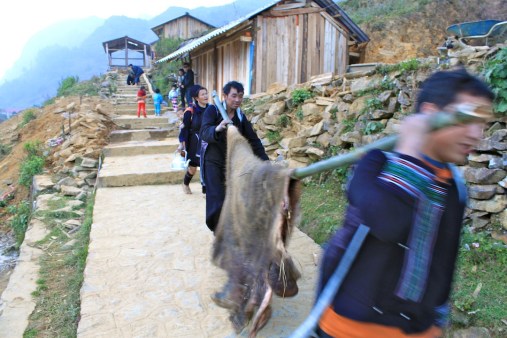 Some Hmong men carrying home a hide… …with baby in tow