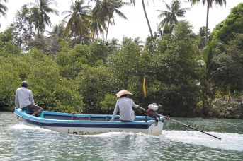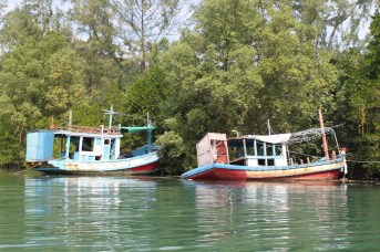 Local villagers passing by Old fishing boats in the estuary