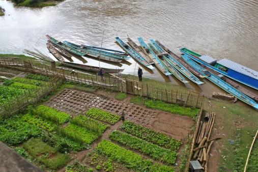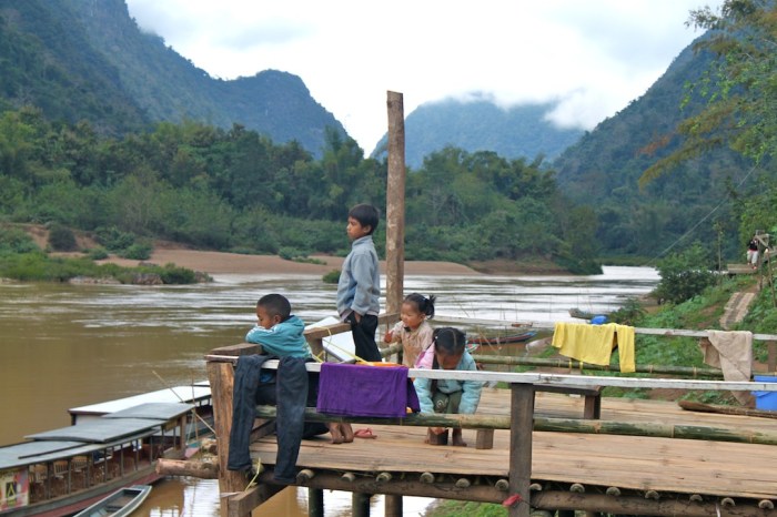 We did manage to tear ourselves away from Luang Prabang for a couple days to visit Muang Ngoi, a sleepy riverside town only accessible by boat. Did you know you can fit 14 people in a minivan? Well, you can in Laos. Packed like sardines with backpacks on our laps, a four-hour minivan ride brought us to the town of Nong Khiaw, where we caught the boat to Muang Ngoi. The jaw-dropping scenery and the tiny villages en route almost made us forget that we were sandwiched knee to knee with tourists and locals (one with a live pig in a bamboo basket) in a tiny boat.
