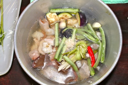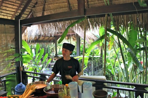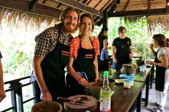 My Birthday Luckily we had a few days to recover from Christmas before my 30th birthday! I never would have dreamed that I’d be turning 30 in Luang Prabang, Laos, and I feel so lucky to have spent my golden birthday in such a special place! Johnny surprised me with a cooking class through Tamarind, so the day started bright and early at a local market where we were guided through the amazing variety of herbs, produce, rice and meats (severed buffalo legs are a little aggressive first thing in the morning!). We were then driven out into the countryside to a beautiful little oasis on a lake surrounded by gardens where our cooking stations were set up. We made all sorts of dishes, each incorporating tons of local herbs, with our main tool being a mortar and pestle. We were stuffed after enjoying the fruits of our labor (sticky rice, eggplant dip, tomato chili dip, fish steamed in banana leaves, lemongrass chicken, pork stew and coconut purple rice pudding).