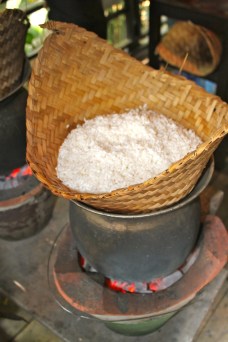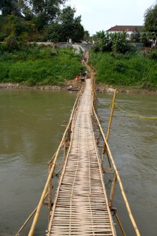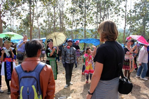 Christmas was our first full day in Luang Prabang, so we set out to explore the old town which sits on a peninsula between the Mekong and Nam Khan Rivers. We happened upon a bamboo bridge and decided to cross over to the other side to see what the area outside the peninsula was like. We had just passed a group of men watching a cock fight when we ran into our new friend, Joel, whom we had met at Christmas Eve dinner the night before. He has been coming to Luang Prabang for the past few years and has made friends with many locals in the process. He happened to be bicycling with his friend James to visit the Hmong New Year celebration in a nearby village. The Hmong people celebrate the New Year at the end of the rice harvesting season, and the festivities usually last around 10 days. James invited us along, excited to show us something he was sure we had never seen before, and after following him down dirt roads through some villages, meeting his friends along the way, we came into a clearing filled with Hmong people, many wearing traditional costumes, playing games, cooking, eating and having a really good time. Everyone was so friendly and happy, and everywhere we looked smiling faces greeted us with ‘Sabaidee’ – ‘hello’ in Laos.