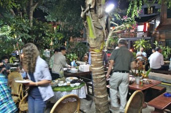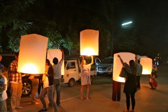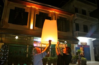 Vong invited everyone at the guesthouse for another dinner on New Year’s Eve…lucky us!! After strolling around the streets and checking out all the festive decor in town and listening to the monks chanting in the many temples, we returned to Chitdara2 for our NYE party. Vong’s wife prepared a traditional Laos feast with sticky rice, noodles, papaya salad, chicken, buffalo, chili spread and more delicious desserts. This time around, we met families from Germany and Australia and a fun couple from Norway, along with Vong’s friends and neighbors and Joel. The best part about the night was the hundreds of glowing lanterns being released into the sky. They started as soon as it got dark and continued to rise till after midnight. There were so many in the sky, they looked like giant, orange stars.