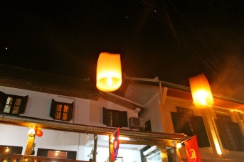 We also didn’t realize that fireworks are legal to set off in Luang Prabang, until Vong, the Australians and the Norwegians all appeared with stashes of them. I thought they’d just be little sparklers, but they were actually huge, awesome fireworks shooting up through the palm trees! At midnight, up and down the street along the river, there were all sorts of fireworks and other explosives going off, accompanied by flaming lanterns soaring through the sky. It was quite an unforgettable site, and I think everyone was relieved that nothing caught on fire! To top it off, Vong passed around champagne to everyone for a New Year’s toast. Definitely a New Year’s Eve to remember!!