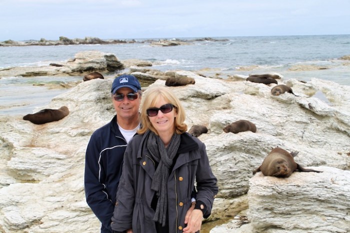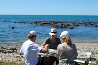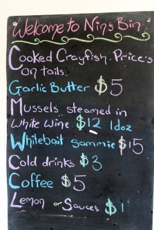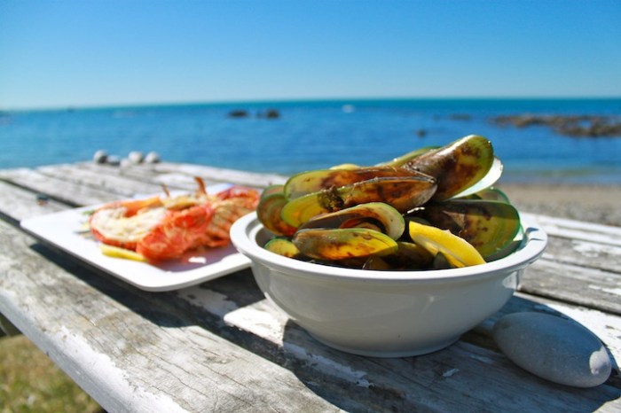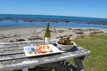 After a lovely two days in wine country we headed to the coast where the mountains meet the sea on the rocky peninsula of Kaikoura. Crayfish, which resemble small lobster, are a big deal in these parts (Kaikoura is a Maori name which literally translates to ‘meal of crayfish’) so crayfish and another regional specialty, greenlip mussels, were first on our agenda. After stopping to watch some playful seals, we pulled off the side of the beautiful coastal road heading into Kaikoura at Nin’s Bin for some fresh seafood. Johnny had read that Nin’s Bin was a must-stop, and we were not disappointed. The menu and set-up were simple: a bin of crayfish (caught that morning) marked with prices, a couple pans on a stove-top and fresh mussels. We picked out our crayfish, had it prepared with garlic butter, grabbed some mussels in white wine sauce with lemons and settled at a table by the sea. Topped off with some Sauvignon Blanc that we had brought from Marlborough, it couldn’t have been a more perfect lunch.