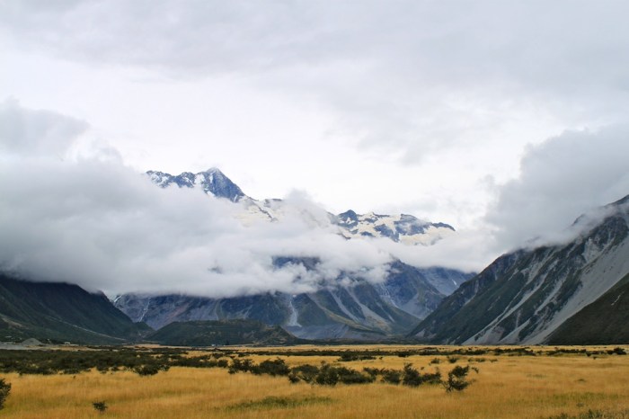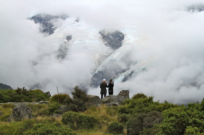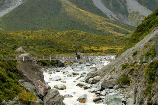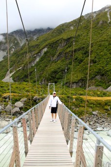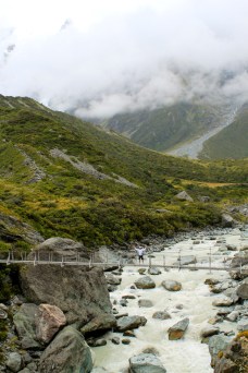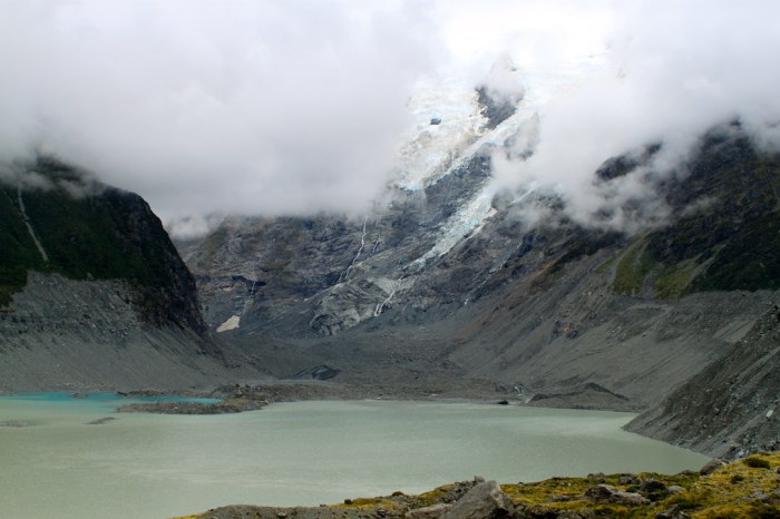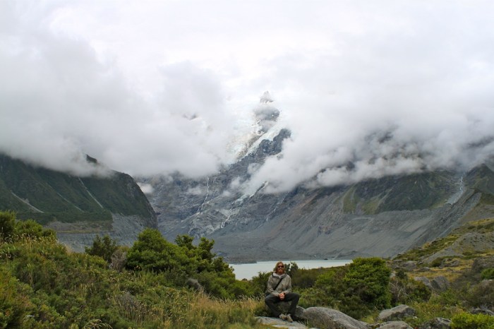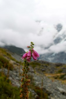 On our last day in the area we drove an hour to Mt. Cook National Park.  At 3,755 meters Mt. Cook is New Zealand’s tallest peak, and it’s where local legend Sir Edmund Hillary would prepare for his summits of Everest.  We hiked into the nearby Hooker Valley, which took us across a couple swing bridges and up to the end of the Hooker Glacier.  Unfortunately it was a little cloudy that day, and we weren’t able to see Mt. Cook in all its glory, but it was cool to see it jutting up into the sky and living up to its Maori name, Aoraki, meaning “Cloud Piercer”.