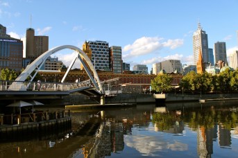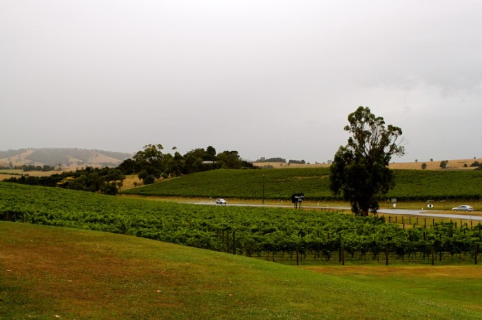 Despite having to move into a new place all day Saturday, Chad and Lisa (and Julian) picked us up early Sunday morning for a day out in the Yarra Valley, a wine region located about an hour northeast of the city which reminded us a lot of Sonoma County.  Our first stop was the Healesville Sanctuary.  I mean, Anna and I couldn’t come all the way to Australia and not see some kangaroo and koala, right?  They were super cool, as were the echidna, platypus and gigantic pelican.  Next we headed for an amazing lunch at Innocent Bystander before tasting some wines at Balgownie Estates.  Anna’s brother Pete had told us to be on the lookout for some sparkling Shiraz wine in Australia, and we found some at Balgownie.  Unfortunately it was a little pricey for us, but Chad and Lisa treated us to a bottle.  Thanks guys!  Alright, next time you are in Newport Beach, the Balboa Bars are on us.  After wine tasting we headed back to the city for a couple beers and walked all along the Yarra River until Julian’s bedtime…which was well past Anna and Johnny’s normal bedtime.  Such a fun day.