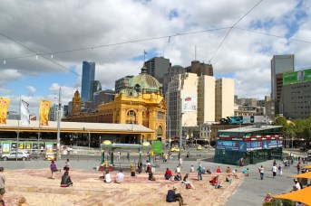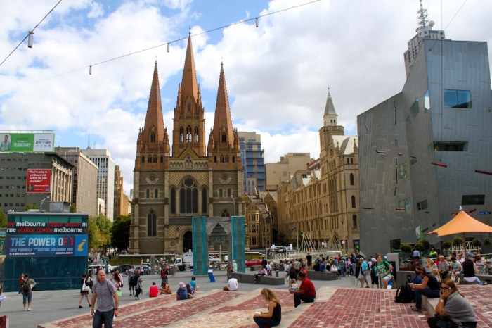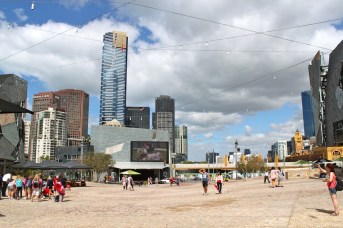 Flinders Street Station from Federation Square Federation Square playing the Super Bowl