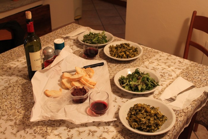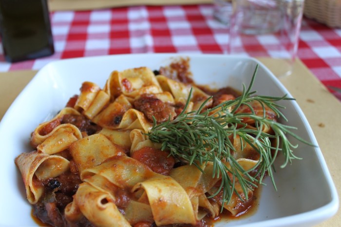 I have a newfound respect for those little ladies you see in the back of shops and restaurants in Italy making homemade pasta. The ingredients are simple (eggs and flour) but the work is backbreaking. Even super buff dudes like Brian and me got a little winded during the pasta making process. First, we very slowly combined the eggs and flour, whisking the entire time to thicken up the dough. It’s a forearm exercise if there ever was one. After maybe 30 or 40 minutes, we finally had a ball of dough ready for kneading. Kneading is the process of strengthening the dough by further mixing the ingredients (so says Wikipedia), and it’s tough work as well. After only about five minute of it, I seriously “kneaded” a nap. Haha…get it? It’s a play on words. OK, back to the food. Once we finally had our dough ready, we flattened it out with our rollers, folded it and sliced it to make our pappardelle.