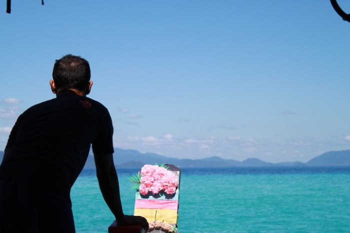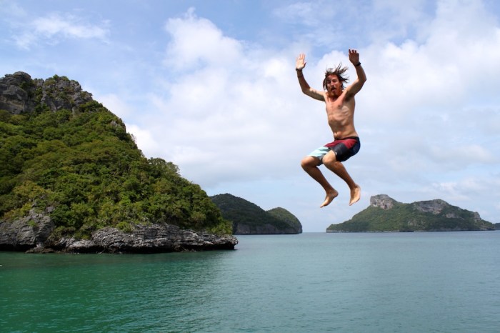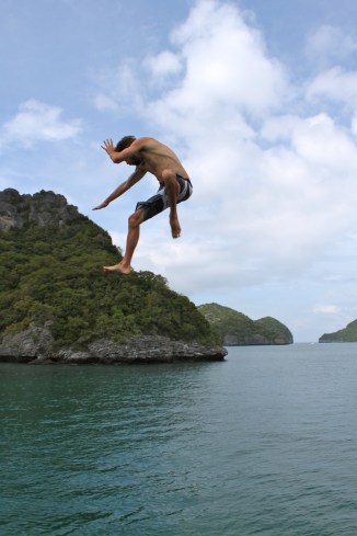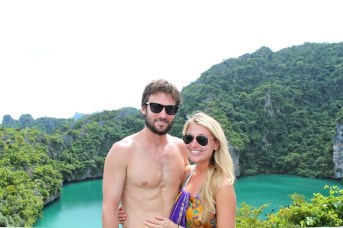 On our second full day, we boarded a boat for Angthong Marine Park, an archipelago of 42 islands to the west of Koh Phangan and presumably the setting for everybody’s favorite backpacking novel, Alex Garland’s The Beach. Our boat, Orion, was a little slow, crowded and grubby, but the scenery…and super cool upper-deck diving board…more than made up for it. We arrived to the cluster of islands after about an hour boat ride trough some tropical morning showers. Anna and I thought the scenery looked a little bit like a less dramatic, more tropical Ha Long Bay. We stopped off for a quick snorkel in Koh Wao before heading to Koh Mae Ko and hiking up to a viewpoint of the island’s stunning, emerald green saltwater lagoon. The steep hike and climb up some makeshift ladders was a little gnarly. Let’s put it this way, if it was in the U.S., we would have had to sign insurance waivers and be strapped into harnesses. However, as you can see in the pictures below, it was worth the effort. Seeing this beautiful lagoon hidden on a tiny island in the middle of a protected marine park definitely had us feeling a little bit like the characters in The Beach (with me being Leonardo DiCaprio, obvi). After some lunch on the boat and a beach break at Koh Wua Talap, Orion brought us slowly but surely back to Koh Phangan for some well-deserved Singhas.