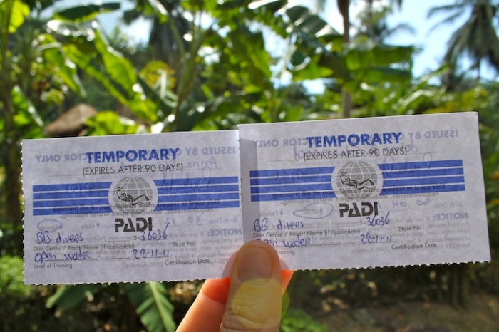 We’ve spent the past three days on the beautiful island of Koh Chang getting scuba certified! We can owe the decision to get certified to my brother who bought us lessons last Christmas through Sport Chalet in anticipation of he and his girlfriend meeting up with us in Thailand this coming January. They love to dive and wanted to be able to take advantage of Thailand’s infamous diving with us. With work and a tight schedule leading up to our trip, we realized we weren’t going to be able to fit in the scuba classes at home (plus we weren’t very excited about taking our first dives in the freezing cold ocean at home in February!), so we opted to get certified once we arrived to Thailand through BB Divers. What a great decision that turned out to be!! Not only did we have the most awesome instructor of all time, Patrick, who exemplifies the lifestyle around here…(he came here 8 years ago from Holland on vacation and never left and told us that ‘he doesn’t make tons of money, but that he loves what he does and loves his life’ – a simply perfect outlook if you ask me); we also had the most fun dive crew, the most beautiful backdrop and crystal clear, warm water.