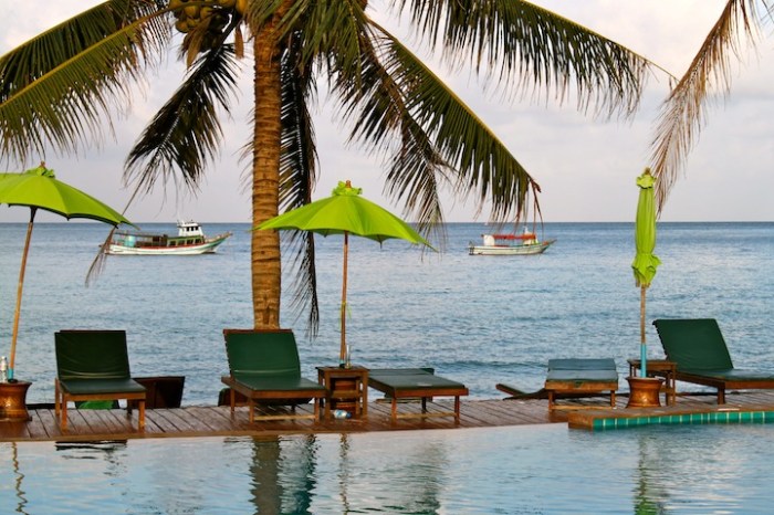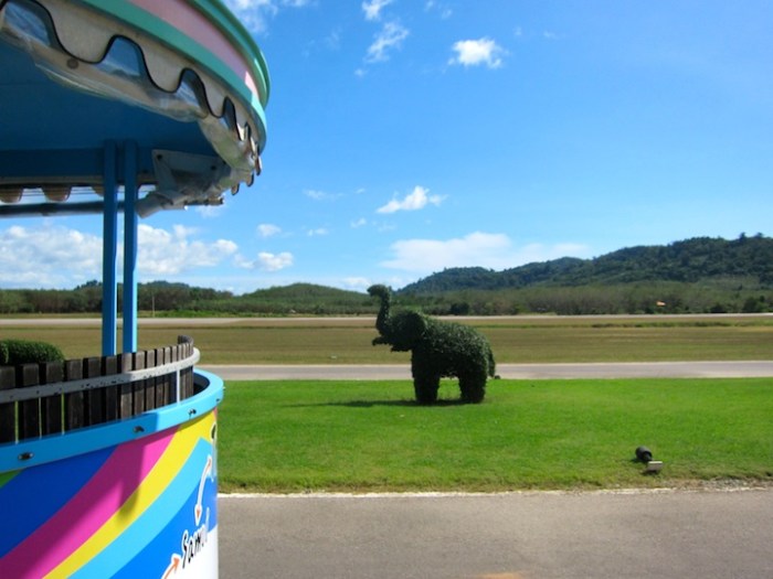 After traveling for 27 hours with barely any sleep, the planet seems a little off kilter. In a half-conscious haze Johnny and I knew that good things were upon us as we arrived at our final airport in Trat, Thailand. We were driven from the runway in a Disneyland-esque trolley past elephant topiaries to the thatched-roof “terminal” where nice, smiley men handed us our luggage. The good vibes continued to grow stronger as we boarded the ferry boat to Koh Chang and experienced our first Thai fruit shake. Another very warm and friendly lady scooped an entire mango out of its skin, plopped it in a blender and added a big mound of ice. Whiz, brrrrr, and voila! Mango shake. Maybe the most sweet, delicious shake I’ve ever had, and for $1 to boot. The journey continued to our first stop, Little Eden at Lonely Beach. Not just a clever name, these bungalows nestled in the palm trees really became a little paradise for us.