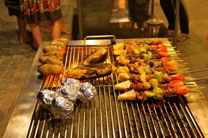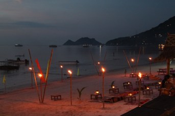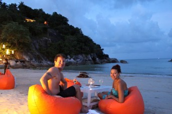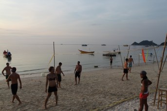 Besides diving, the other highlight of Sairee Beach was the BBQ! I don’t know if we had just worked up an appetite from diving or if the setting along the beach with the sunset influenced our taste buds, OR if the fact that we haven’t really had much BBQ in 8 months, but this was one of the best BBQs I’ve ever had! And the best part was that two giant skewers, salad and a baked potato cost 100 baht, or roughly $3.00. After watching some pretty athletic ladyboys dominate a volleyball game on the beach and taking in a beautiful sunset, we ate a whole lot of BBQ. It was so good, and we felt that it could only get better topped off with a peanut butter banana crepe from a street cart on the yellow brick road. As if this weren’t indulgent enough, Peter and Sheryl also decided that a foot massage was in order. A pretty perfect day if you ask me. In fact, it was so great, that we basically repeated it the next day: scuba – lunch – beach – volleyball – sunset – BBQ. Before we knew it, our time on Koh Tao had come to an end, and we were packing up our bags to make a return visit to Koh Phangan!