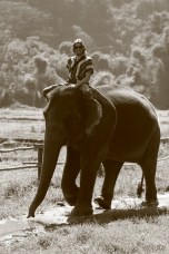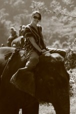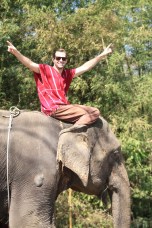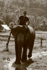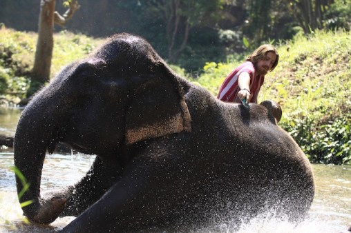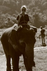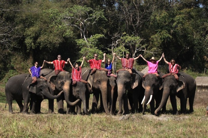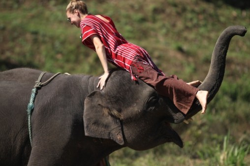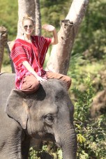 After learning some basic commands in Thai (like “good boy/girl,” “go,” and “stop”), we watched a demonstration on how to mount our elephants and were then sent out to give it a go. This was both hilarious and a little intimidating as you either had to launch yourself over the elephant’s head, or do a one-footed trunk rise or a one-footed leg rise up to the top of the elephant’s head. Needless to say, it was a pretty awesome experience to sit atop our elephants for the first time, bare-back, with our feet tucked behind their warm flapping ears and feeling the prickly hairs on the top of their heads.