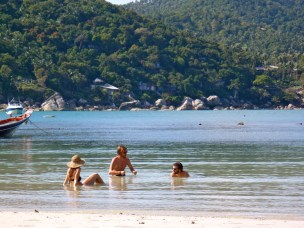 Anna and I had been looking forward to coming back to the Thai islands ever since we left Koh Chang in late November, and the fact that we were going to share the next few days in this beautiful part of the world with some of our favorite people made us downright giddy. A bumpy, partly off-road minibus ride brought us from Haad Rin (home to the infamous Full Moon Party) to Thong Nai Pan, where two coves form a scenic double bay on the northeast of Koh Phangan. We stayed on the southerly Thong Nai Pan Yai, which had enough going on to keep our attention for a few days while being off-the-beaten-path enough to make us feel like castaways. After checking into our bungalows at Longtail Beach Resort, we had just enough time for a quick dip before it got dark. Swimming in the clear, warm water with our entourage of eight while looking back at the white sand beach and surrounding lush jungle in the afternoon light definitely gave me a case of the warm and fuzzies. We grabbed some dinner at a beachside restaurant, hit the sack early and spent the entire next day lounging on the beach.