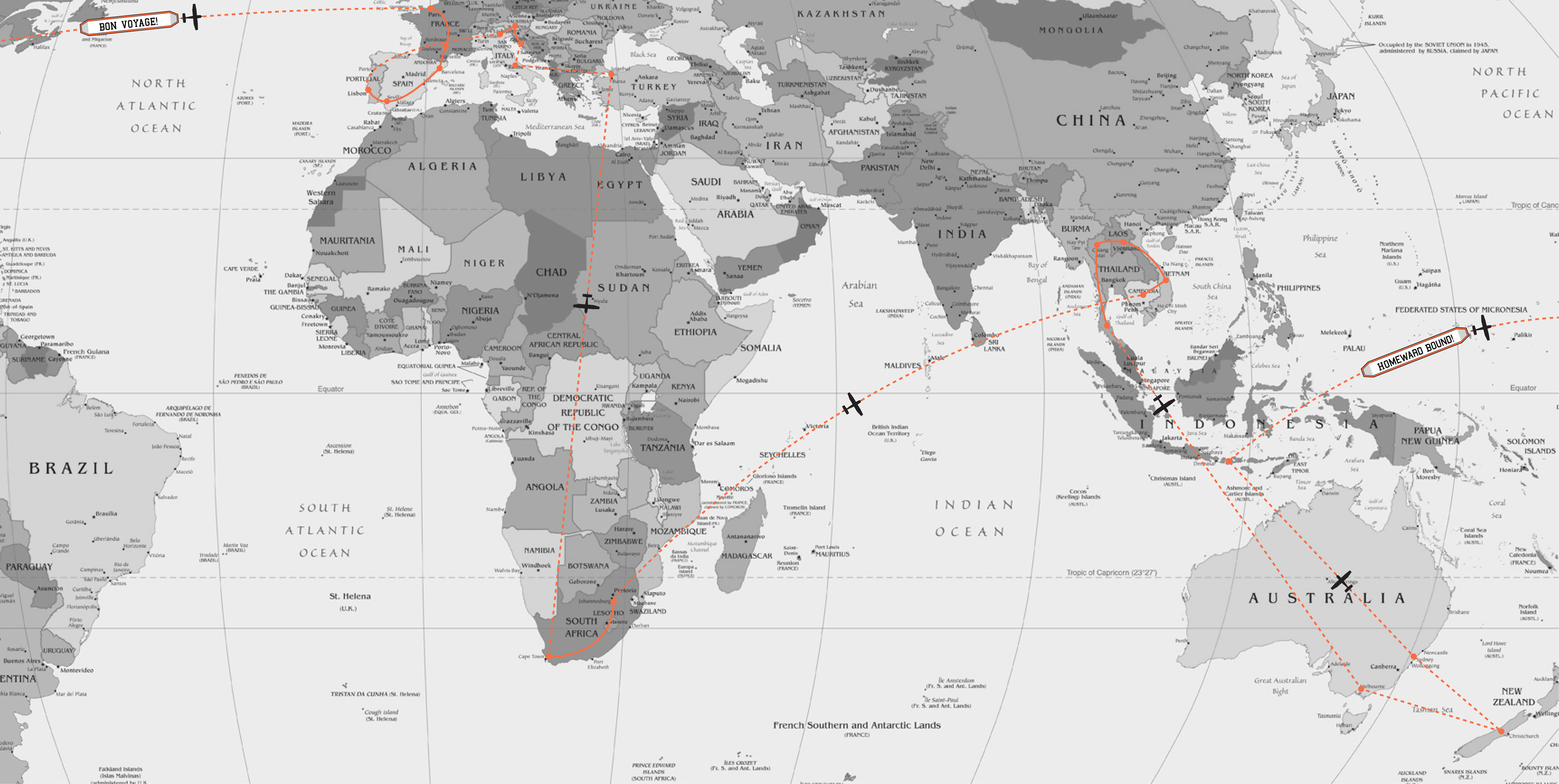 Our adventure begins when we land in Dinard, France on May 24, 2011. From there, we’ll be making our way across Europe, down to South Africa, over to Southeast Asia, down to Australia, over to New Zealand, up to Indonesia and finally back home to California. Depending on how we’re doing on our budget, our level of homesickness and Phish tour date announcements, we’ll probably be on the road anywhere from 10-12 months…if not indefinitely.